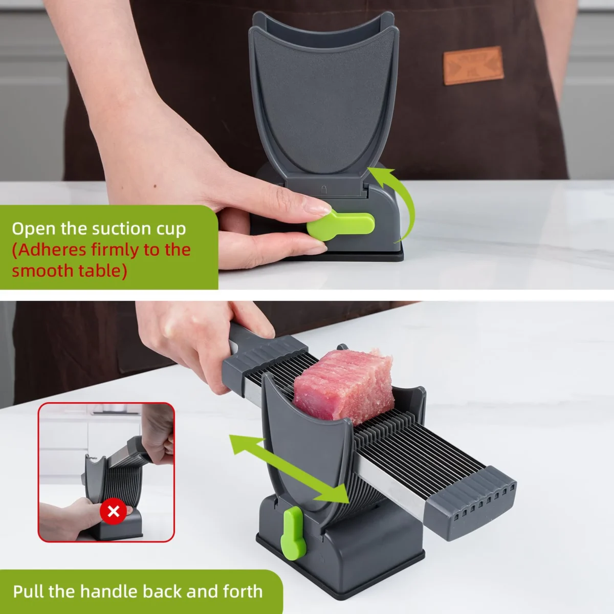 High quality: Our meat slicer blades are made of high-quality stainless steel with 8° sharp blades for professional-grade cutting, open the bottom suction cup, which can be firmly fixed on the smooth tabletop to ensure that it will not shake during use